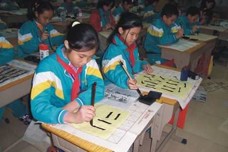 學校根據上述奮斗目標,結合學校實際,廣泛開展書法教育科研工作,并把教育科研工作與學校特色建設相結合,與新課程實施結合起來。在杜志清校長的親自帶領下,學校大力開發書法校本課程,書法教育“走了進教材、走進了課程、走進了教育的全過程”,學校內掀起了書法學習的熱潮。師生的書寫水平大面積提高,培養了一批書法特色教師和一大批書法特長生。其中,杜志清校長的作品入選廣東省新人新作展,梁婉紅副校長的作品入選第三屆全國榜書大賽展,杜少艷,黃萬可等36名教師分別獲得全國“新世紀杯”教師“三筆字”比賽二、三等獎,教師技藝的提高為書法校本課程的建設奠定堅實的基礎。師生參加全國、省、市、區的各項書法比賽有128人次獲獎,國家級獎勵26人次。書法教育大大地豐富了學校的文化內涵,提升了學校辦學的品味。現已成為學校文化建設中令人矚目的新增長點。 |