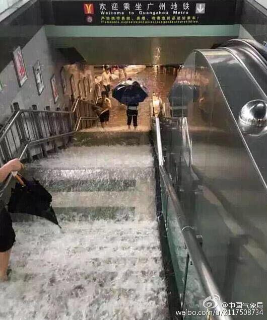 廣州暴雨公交內水流成河 雨水倒灌地鐵成瀑布