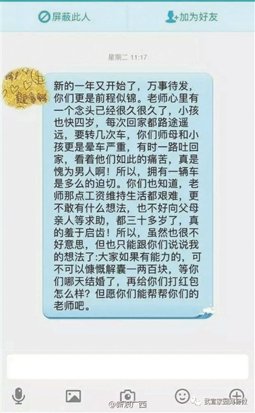 爆料帖中同時上傳了多張聊天記錄,其中一張顯示:“新的一年又開始了,萬事待發,你們更是前程似錦。老師心里有個念頭已經很久了,小孩也快四歲了,每次回家都路途遙遠,要轉幾次車,你們師母和小孩更是暈車嚴重,有時一路吐回家,看看他們如此痛苦,真是愧為男人啊!所以,擁有一輛車是多么的迫切。你們也知道老師那些工資維持生活都很艱難,更不敢有什么想法,也不好向父母親人求助,都三十多歲了,真的羞于啟齒!所以,雖然也很不好意思,但是也只能跟你們說說我的想法了:大家如果有能力的,可不可以慷慨解囊一兩百塊,等你們哪天結婚了,再給你們打紅包怎么樣?但愿你們能幫幫你們的老師吧。”