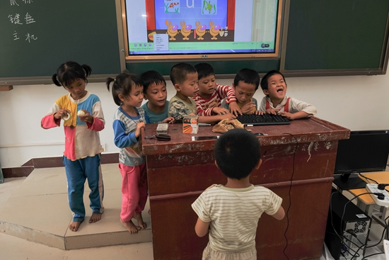 4月11日,大華寮村教學點,學生們圍觀上課用的電腦。這是該教學點第一次使用多媒體教學設備,也是大部分學生第一次見到電腦。