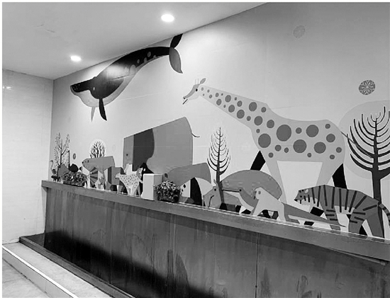 這是一間男生廁所,藍色系的背景墻上,各畫了一只長頸鹿和一條鯨魚,底部還有大象、熊貓等卡通形象。廁所隔間的門板上,也是同系列的兒童畫。