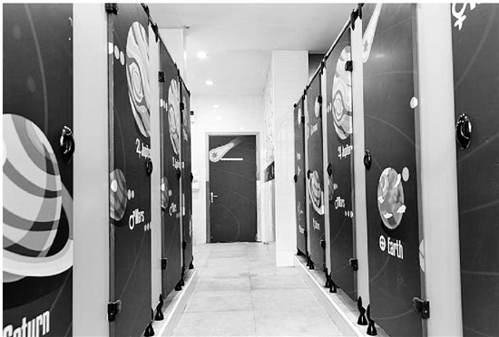 同行的女同事,去逛了下旁邊的女廁所,畫面又迥然不同。畫的是科技主題,以女生喜歡的紫色偏暖色調為主,只見墻上添加了不少火箭、星球的簡筆畫浮雕裝飾,整體感覺更加溫馨。
