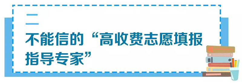針對考生父母“望子成龍”“望女成鳳”的心理,特別是高考時希望子女能實現“鯉魚跳龍門”的愿望,近年來一些商業機構涌入志愿填報指導市場。各種噱頭廣告令人眼花繚亂,如“精準定位院校”“與C9、985、211院校成功牽手”“著名部屬高校權威志愿填報專家組成團隊”“志愿推薦成功率>99%”等等。專家還被包裝成“特約”“首席”“明星”“金牌”等等。收費更是高得離譜,有的是39800元起,有的5萬元套餐。