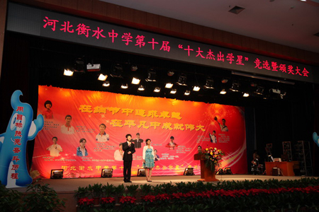 經過現場評委的打分,最終,387班張慕晨、420班韓澤鵬、428班劉依慧、410班李藝超、387班李涵悅、382班趙亞玲、410班武博陽、403班王子琪、394班劉保磊、396班羅天擎十名同學榮獲衡水中學第十屆“十大杰出學星”稱號。同時,何壽媛等八名同學獲得“優秀學星”稱號。