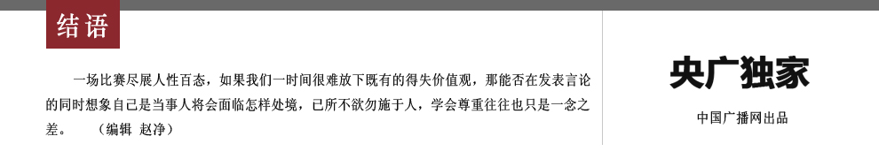 * 報(bào)紙就“恥辱”一詞向周俊致歉:上場(chǎng)已是英雄 今日早報(bào)發(fā)文致歉:其實(shí),我們已經(jīng)知道你足夠努力,我們更知道你還只是個(gè)孩子,但卻忽略了勝敗乃常事,體育競(jìng)技中體現(xiàn)出的追求更高、更快、更強(qiáng)的精神才是最為寶貴的要旨。你既已上場(chǎng),并全力以赴,已是我們的英雄。周俊妹妹,我們?yōu)槲覀兊牡图?jí)錯(cuò)誤鄭重向你道歉,并盼你以后的路越走越好,最重要的是,要快樂,我們會(huì)一直為你守望。 【詳細(xì)】