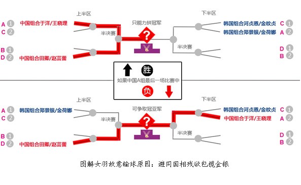 由于中國隊的另外一對組合田卿/趙蕓蕾以3戰2勝的成績奪取了小組賽D組第二的成績出線,所以他們淘汰賽中的第一個對手將是中華臺北的程文欣/簡毓瑾組合,如果能夠戰勝對手而進入下一輪,那么他們將迎來A組第一名和D組第二名之間的勝者,也就是說,如果A組的中國選手于洋/王曉理今在今晚的比賽中戰勝韓國組合鄭景銀/金荷娜的話,那么于洋/王曉理將奪取A組小組第一的位置,這樣的話,這兩隊中國選手就等于說被分在了同一個半區,也就是說在決賽之前中國隊將要提前“自相殘殺”