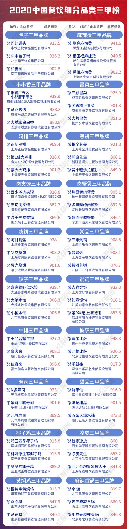 “2020中國餐飲(細分品類)三甲品牌”評選的是餐飲細分品類的三甲品牌,共有20大品類共60個品牌上榜,表彰的是在各自細分品類大放異彩的卓越品牌。巴比饅頭、張亮麻辣燙、鋼管廠五區小郡肝、正新雞排、糧全其美等品牌在各自的細分賽道中表現不俗,拔得頭籌。