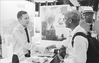 在非洲電視節上,非洲客商對于中國影視節目展現出濃厚興趣。圖為非洲客商向中國企業展臺工作人員咨詢合作事宜。本報記者 李志偉攝