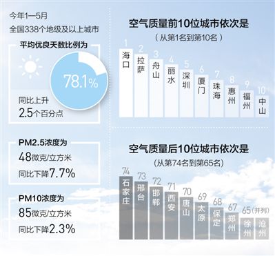 生態環境部日前發布今年前5月全國城市空氣質量狀況,1—5月,全國338個地級及以上城市平均優良天數比例為78.1%,同比上升2.5個百分點。PM2.5濃度為48微克/立方米,同比下降7.7%;PM10濃度為85微克/立方米,同比下降2.3%。