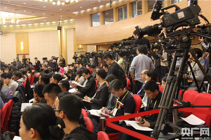 10月20日,十九大新聞中心舉行記者會。圖為記者現場采訪拍攝。央廣網記者鞏盼東攝