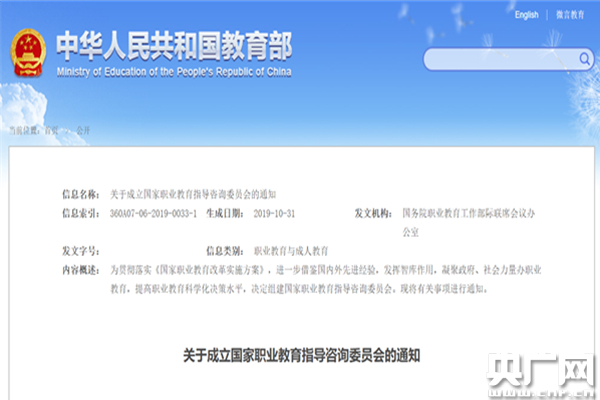 《關于成立國家職業教育指導咨詢委員會的通知》文件發布 (央廣網發 來源:教育部官網)