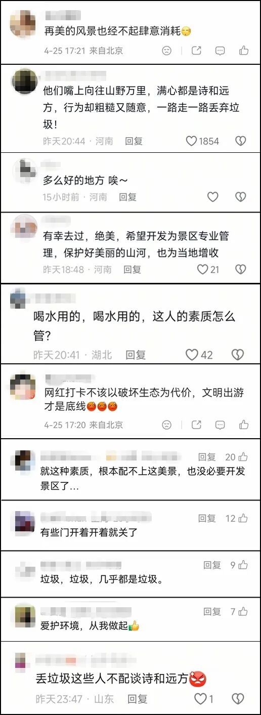對此,不少網友十分痛心,表示“幾乎都是垃圾”,還有網友表示“有些門開著開著就關了”“再美的風景也經不起肆意消耗”。