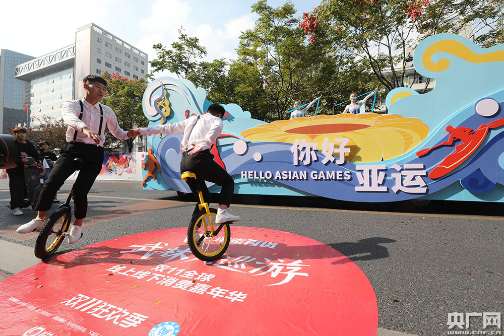 11月10日,“你好 亞運”花車邊上演青春活力的獨輪車表演(央廣網(wǎng)記者 魏煒 攝)