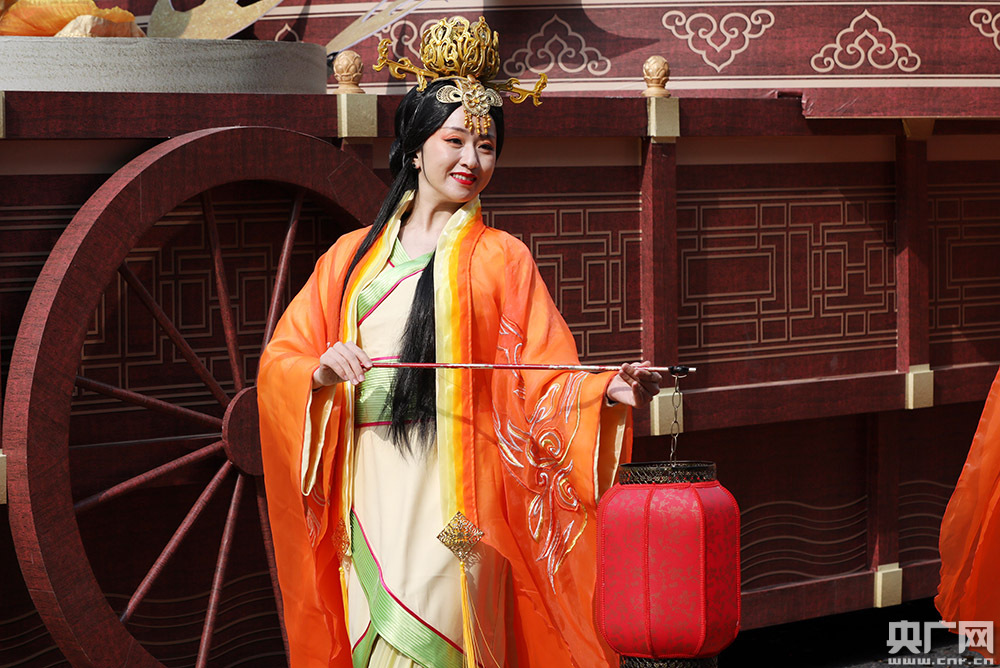 身穿漢服的演員在“有鳳來儀”花車邊演藝古典風(fēng)情(央廣網(wǎng)記者 魏煒 攝)