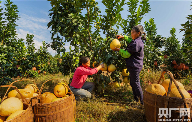 央廣網永新11月20日消息(記者胡斐 通訊員朱國朝、周亞茂、陳春久)初冬時節,蜜柚飄香。江西省永新縣象形鄉高田村扶貧基地千畝蜜柚已經成熟,滿山柚林掛滿了金黃色的柚子,果農抓住晴好天氣加緊采摘、搬運入庫、分揀裝箱,供應市場。今年該基地柚子產量將達60萬斤,又是一個豐收年。據悉,該基地吸收238戶貧困戶入股分紅,戶均增收2000余元。