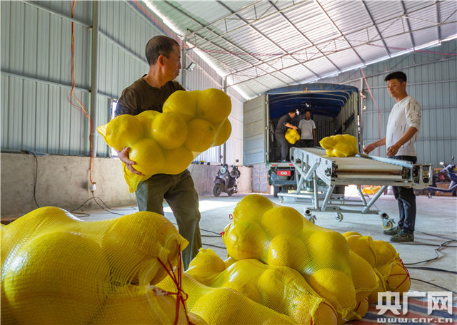 果農把剛采摘的柚子搬運上車,銷住外省。(通訊員拍攝)
