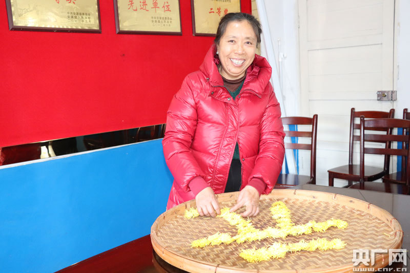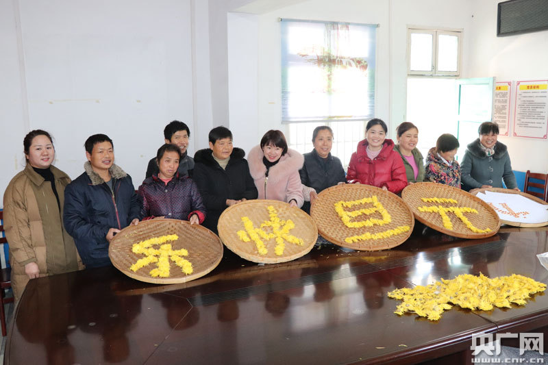 安源鎮(zhèn)張家灣村貧困戶用豐收的干菊花擺出元旦快樂字樣(央廣網(wǎng)發(fā) 通訊員鄔斌 攝)