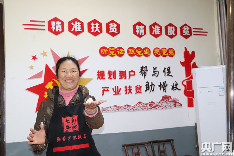 安源鎮(zhèn)安源村貧困戶展示剛剛包好的餃子(央廣網(wǎng)發(fā) 通訊員鄔斌 攝)