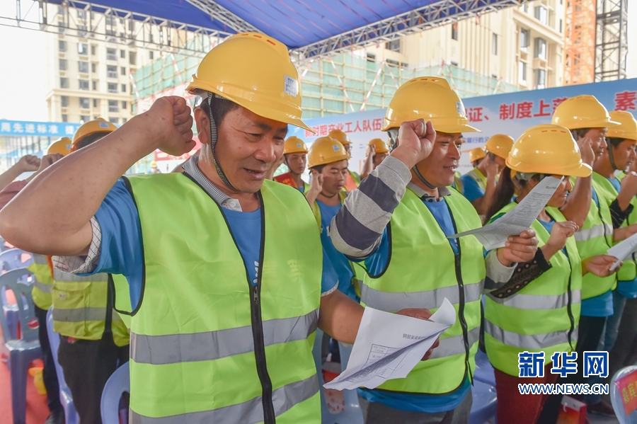 4月26日,在福建省廈門市集美區(qū)中建三局國貿天悅項目工地,工友在入會儀式上宣誓。新華社記者 宋為偉 攝