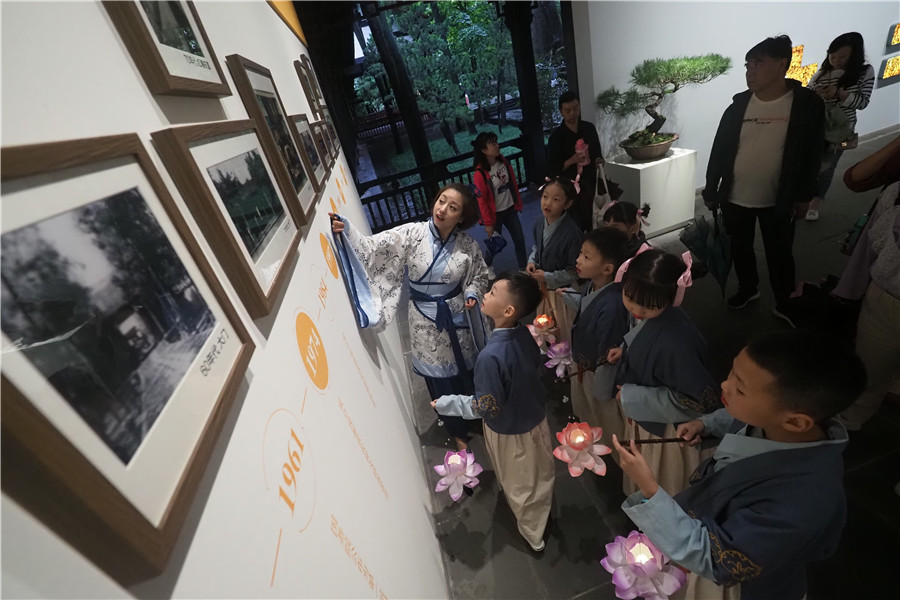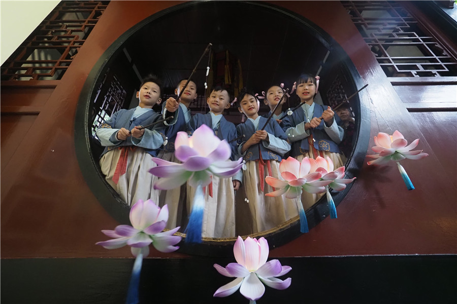 中秋節當天,身著傳統漢服的成都武侯祠小小講解員在博物館社教老師帶領下,以文化小使者的身份傳揚我們的節日,傳承傳統文化。小朋友們手提“荷花燈”,一邊在祠堂古跡中巡游,一邊吟誦名篇佳句,向沿路相遇的博物館觀眾傳遞美好的祝福、分享節日的喜悅。游客們穿梭于古建園林之間,又被響起的悠揚古樂所吸引而駐足:二胡、琵琶、古箏、箜篌、古琴、中阮、笛,各種傳統樂器編織了最浪漫的佳節情懷,讓觀眾在節日氛圍中與傳統音樂不期而遇。