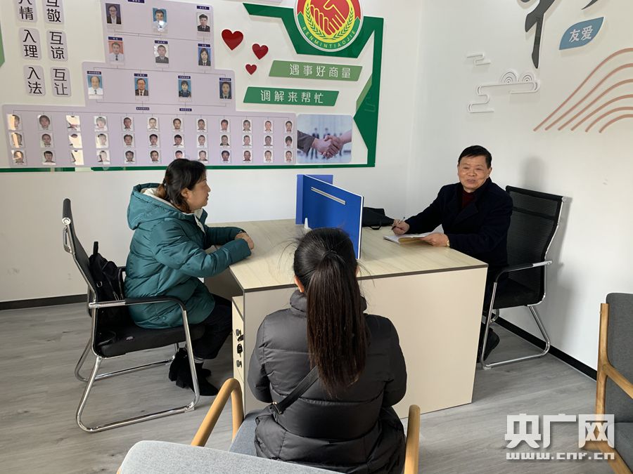 “五老”志愿者俞金生正在調解基層矛盾(央廣網記者 張國亮 攝)