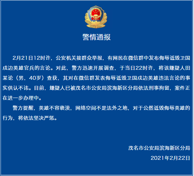 2月21日12時許,公安機關接群眾舉報,有網民在微信群中發布侮辱詆毀衛國戍邊英雄官兵的言論。對此,警方迅速開展調查,于當日22時許,將該嫌疑人田某論(男,40歲)查獲,其對在微信群發表侮辱詆毀衛國戍邊英雄違法言論的事實供認不諱。