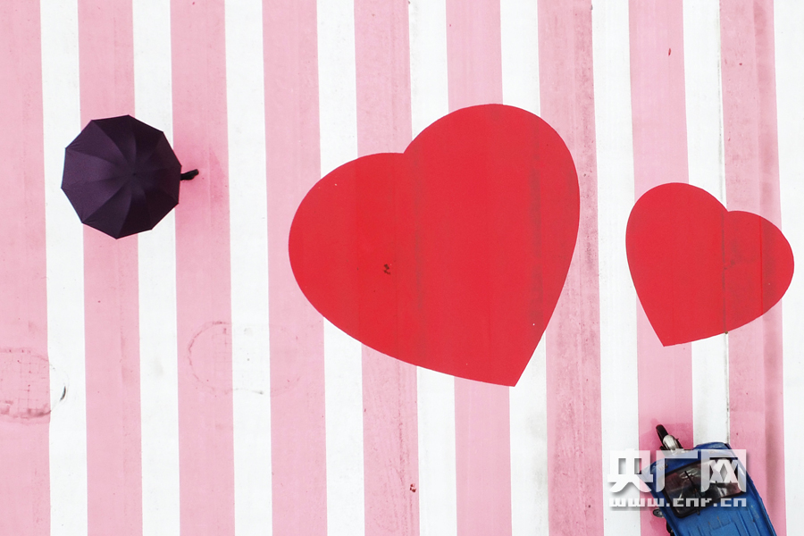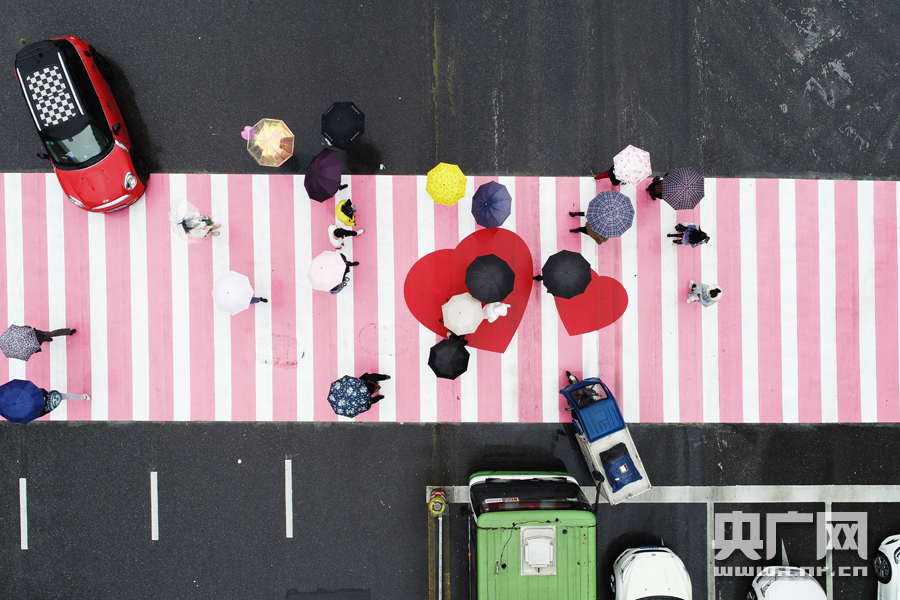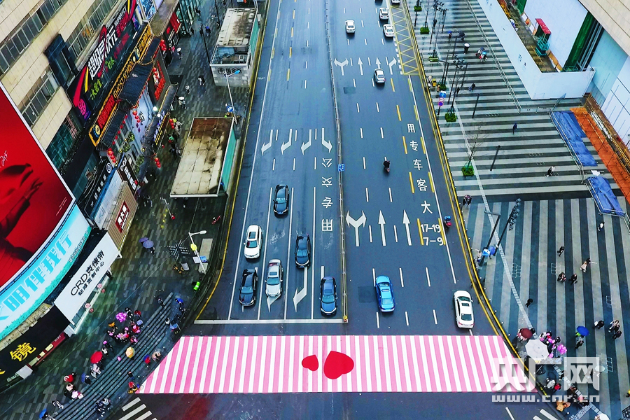 央廣網長沙3月8日消息(記者傅蕾) 3月8日一大早,長沙司門口附近早起的市民發現,解放西路上的斑馬線變成了粉紅色。路人紛紛拍下圖片和短視頻,發布到抖音、微博,這條十字交叉斑馬線被粉刷成粉紅色和白色相間,并點綴著紅色愛心。