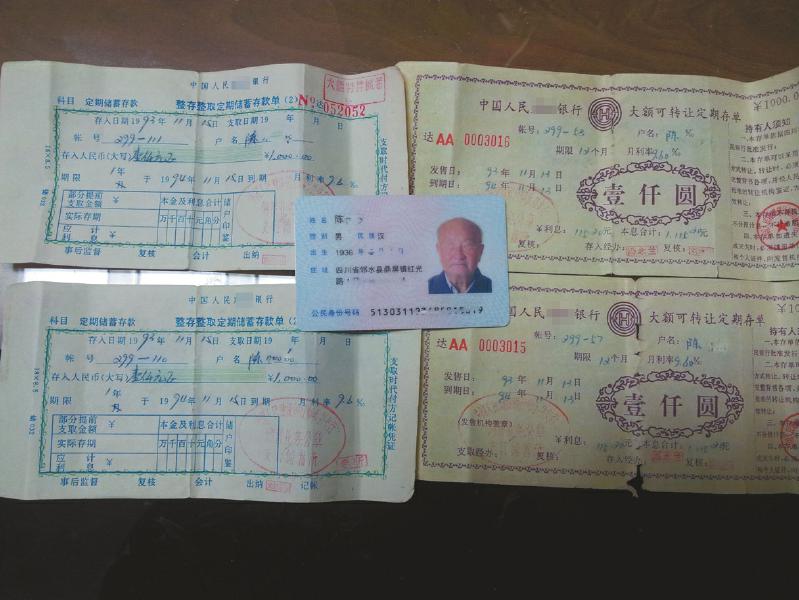 1993年11月,家住廣安市鄰水縣鼎屏鎮的陳姓老人先后兩次共存入鄰水某銀行4000元錢,并一直保存著銀行出具的4張存款單。后來,老人一家遷往達州市定居。今年4月,老人去世,家人在整理其遺物時發現了這4張存款單,同時找到的還有幾張其他銀行的存款單。家人順利將其他銀行存款單里面的錢取出,唯獨4張某銀行存款單遭遇了“無處取錢”的尷尬。