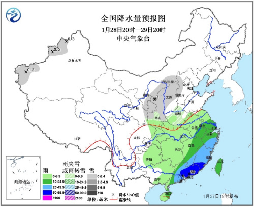 27日20時至28日20時,新疆西部、西藏東部等地的部分地區有小到中雪或雨夾雪;江南中東部、華南中東部等地有中到大雨,其中,江西南部、福建西部、廣東等地的部分地區有暴雨,局地有大暴雨(100~120毫米)。黃海南部、南海東北部和東南部、東海大部海域將有6~7級、陣風8級風。
