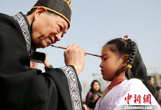 中新網西安2月20日電 (記者 張遠)“奉茶禮、正衣冠、朱砂開智、誦讀經典……”20日下午,聚集于西安漢城湖畔的55名學齡兒童身著漢服,在家長的陪同下進行了一場古韻飄香的“開筆禮”。