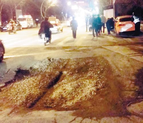 “闖禍的就是那個坑!”轎車司機指著不遠處的路面說:“我就是閃到了那個坑里,導致車輛失控,這才撞上廣告牌的。”順著司機手指的方向,記者看到,不遠處的馬路上果然有一個面積約為10平方米的大坑。目測坑深大約在15厘米左右,坑內填有碎石、沙土,踩上去感覺綿軟。大坑的旁邊還有兩張鐵板。“我猜想,這鐵板原本應該蓋在大坑上的,卻不知道啥原因被挪開了。”