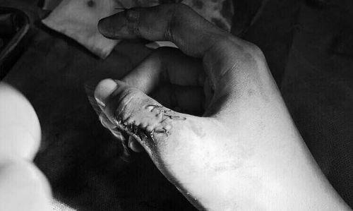 岳先生大拇指受傷縫了數針。