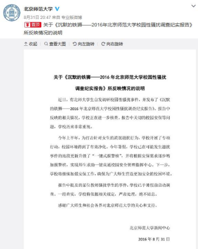 近日,有北師大學生自發調研校園性騷擾事件,并發布了《沉默的鐵獅——2016年北京師范大學校園性騷擾調查紀實報告》。