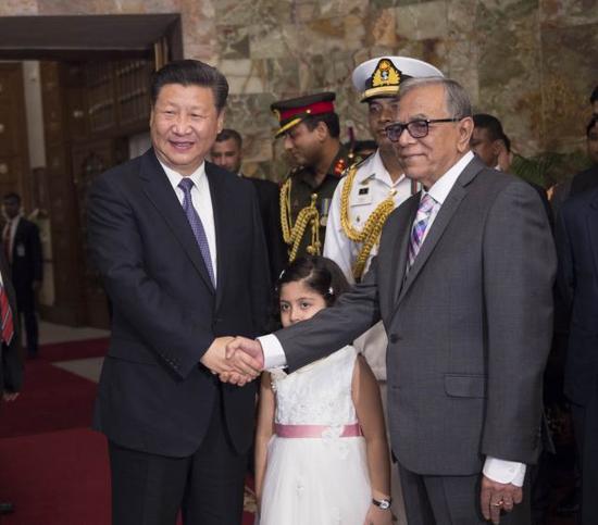 圖為10月14日,國家主席習近平在達卡會見孟加拉國總統哈米德。(新華社記者謝環馳攝)