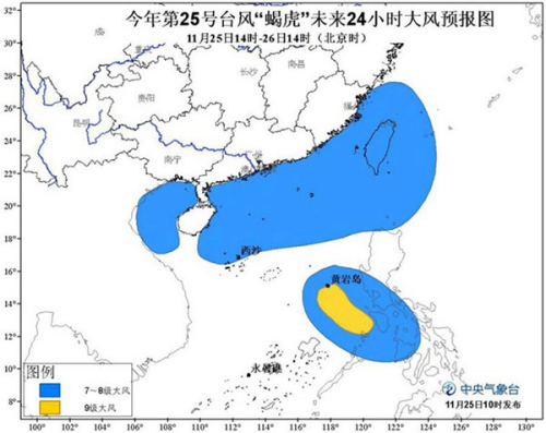 大風預報:受“蝎虎”和冷空氣的共同影響,25日14時至26日14時,福建沿海、廣東沿海、海南沿海、臺灣沿海、東海西南部、臺灣海峽、臺灣以東洋面、巴士海峽、北部灣、南海北部和東南部海域的風力有7~8級,臺風中心經過的附近海域風力可達9~10級。