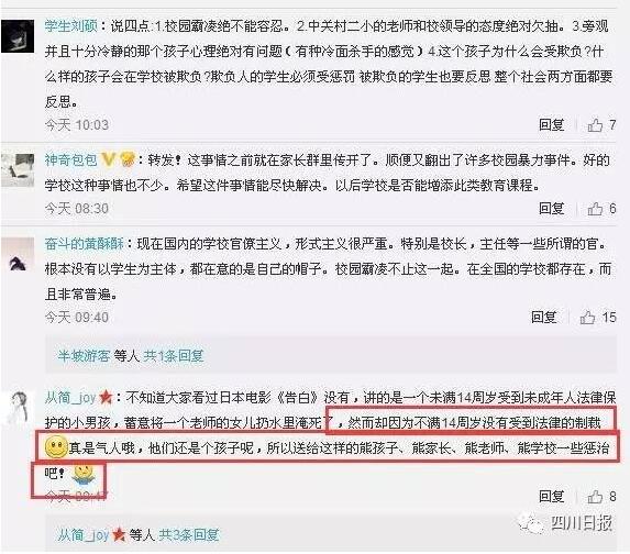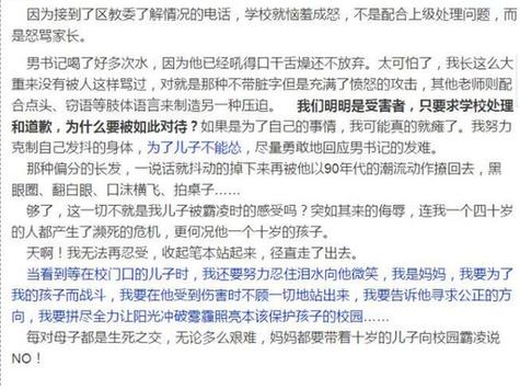 然而正當(dāng)事件不斷發(fā)酵,人們在網(wǎng)上盡情宣泄憤怒時(shí),網(wǎng)上又傳來相反聲音,有網(wǎng)友稱,文中提及受欺負(fù)的學(xué)生以前是班長,從小練習(xí)空手道,并非文中的孱弱形象,孩子的母親以前從事影視編劇,和其中一位涉事同學(xué)的家長有積怨,借勢發(fā)揮。