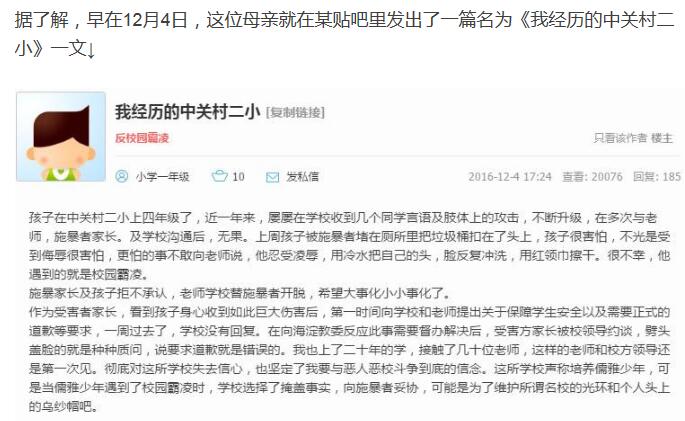 據(jù)了解,早在12月4日,這位母親就在某貼吧里發(fā)出了一篇名為《我經(jīng)歷的中關(guān)村二小》一文↓