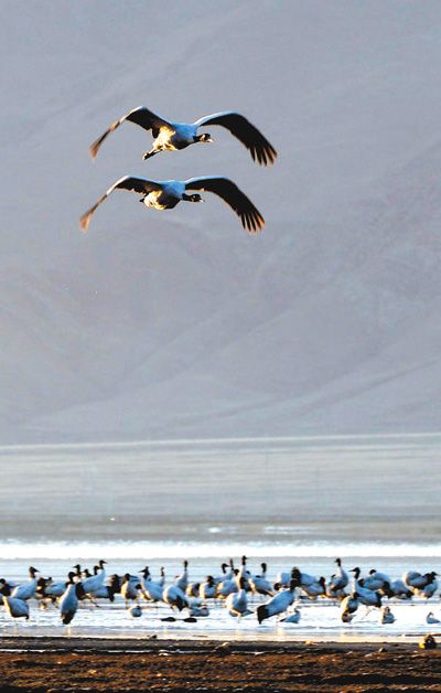 數據顯示,在西藏越冬的黑頸鶴數量逐年增多,數量已由1995年的3000只上升到目前的近9000只,占全球黑頸鶴總數的80%以上。