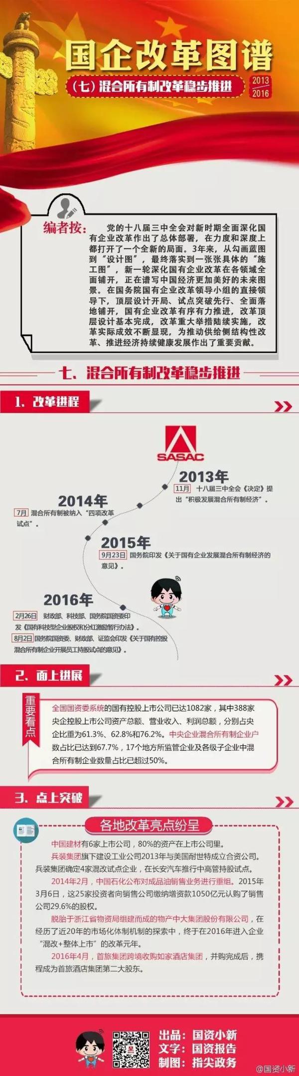 黨的十八屆三中全會對新時期全面深化國有企業改革作出了總體部署,在力度和深度上都打開了一個全新的局面。3年來,在國務院國有企業改革領導小組的直接領導下,頂層設計開局、試點突破先行、全面落地鋪開,國有企業改革有序有力推進,改革頂層設計基本完成,改革重大舉措陸續實施,改革實際成效不斷顯現,為推動供給側結構性改革、推進經濟持續健康發展作出了重要貢獻。小新梳理素材、整合資料,聯合《國資報告》、指尖政務,為大家重磅推出“2013—2016國企改革圖譜”!每天一圖,讓你一圖看懂國企改革。今天,咱們來看國企改革圖譜之七:混合所有制改革穩步推進——