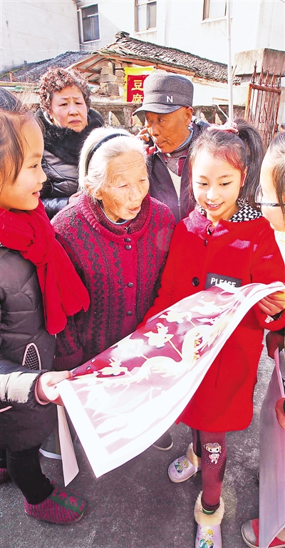 沈揚林(右四)把印好的年畫送給鄉親們。