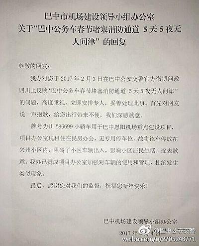 2月4日,巴中公安交警在“問政四川”平臺回復(fù)稱,巴中市機場建設(shè)領(lǐng)導(dǎo)小組辦公室對網(wǎng)友反映的“巴中公務(wù)車春節(jié)堵塞消防通道5天5夜無人問津”一事作出回應(yīng);貜(fù)稱,經(jīng)調(diào)查發(fā)現(xiàn),該車用于巴中市恩陽機場重點建設(shè)項目,由于項目辦公室現(xiàn)租住在民房辦公,無專用停車位,故將車輛停放在興州小區(qū)內(nèi),阻礙了小區(qū)車輛出入,影響了小區(qū)居民生活。