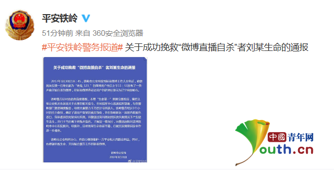 中國青年網北京3月31日電(記者 張瑞宇)3月31日上午,微博@平安鐵嶺 發布一則關于挽救"微博直播自殺"者劉某生命的警務報道。網友反饋一注冊名稱為"老鬼_123_"用戶IP地址顯示為遼寧省鐵嶺市的微博用戶,30日上午11:53發布了一則聲稱開始自殺的微博,后經查找,因投資失敗已喝兩瓶老鼠藥的劉某被警方送到鐵嶺中心醫院救治。