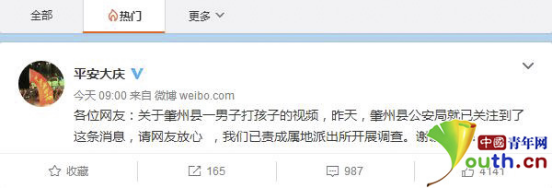 中國青年網北京4月1日電(記者 李永鵬 見習記者 劉利影)近日,一段男子不斷掌摑、毆打女童的視頻在網上流傳,引發網民關注。有網友稱,視頻拍攝地為大慶市肇州縣。4月1日上午9時,大慶市公安局官方微博發布消息稱,肇州縣公安局已關注到相關視頻,并責成屬地派出所開展調查。