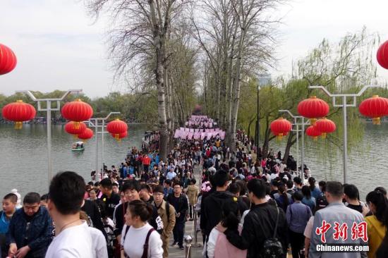 4月2日,清明小長假首日,北京玉淵潭公園迎來賞櫻、踏青高峰。圖為公園內游客眾多。中新社記者 李慧思 攝