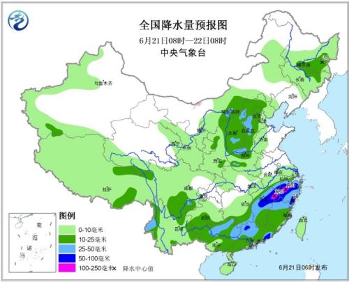 全國(guó)降水量預(yù)報(bào)圖(6月21日08時(shí)-22日08時(shí))