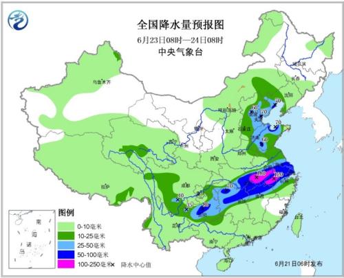 全國(guó)降水量預(yù)報(bào)圖(6月23日08時(shí)-24日08時(shí))