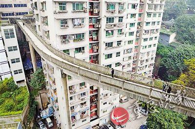 微博上曾有一組照片顯示渝中區一處天橋,橋的一端從地面連接到另一棟樓的13層。該微博發出后,引發了網友對該天橋所在地的各種猜想。