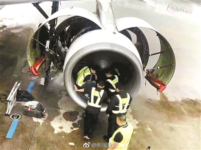 北京青年報(bào)記者27日下午4時(shí)許查詢發(fā)現(xiàn),原本計(jì)劃當(dāng)天中午12點(diǎn)45分起飛的航班依舊處于延誤狀態(tài)。而從許多乘客傳來的照片中可以看到,飛機(jī)旁停放了多輛包括警車在內(nèi)的車輛,飛機(jī)左翼下方的發(fā)動(dòng)機(jī)蓋處于打開狀態(tài),有多位工作人員正在對(duì)發(fā)動(dòng)機(jī)進(jìn)行檢查維修。