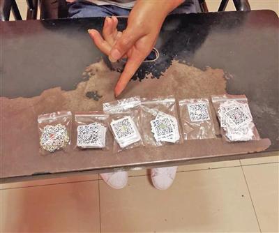 民警從嫌疑人隨身包里共查獲314張二維碼,其中印有“娃娃臉”標志的2張、“一棵小樹”標志的42張、“五角硬幣”標志的68張、“銀聯”標志的73張、“人民幣”標志的98張、“初見”標志的31張。