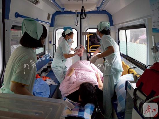 “憋住氣,加油!出力!”葉發(fā)卓不斷引導(dǎo)麥女士發(fā)力,一旁的謝麗紅、鄺淑芬兩位急診護士鋪開生產(chǎn)包上的各種工具,隨時準備嬰兒落地后的護理措施。此時,麥女士的疼痛一下接著一下,越來越頻繁,嬰兒的頭部在母親的發(fā)力下逐步挪動出來,葉發(fā)卓不斷鼓勵麥女士,告知孩子出來狀況,旁邊的人不斷喊“加油”。加油聲和孕婦的呻吟聲交雜在救護車小小的空間內(nèi),車上的人屏著氣等待著新生兒的哭叫聲。